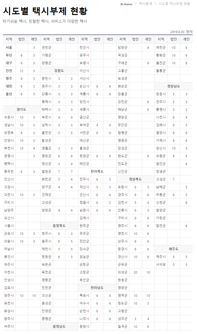 전국택시운송사업조합연합회에서 아래와 같이 시도별 택시부제 현황을 볼 수 있습니다.