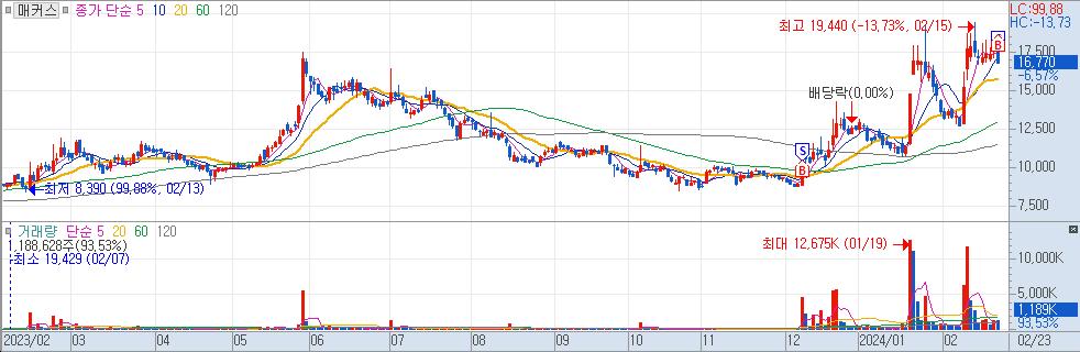 - 매매이유 : 엔비디아 폭등으로 '시스템반도체' 테마에 영향을 줄 것으로 보였다. 해당 테마에서 호가당 수익률이 높은 2개를 뽑아 보니, '에이직랜드'와 '매커스'였다. '에이직랜드'는 이미 실시간 검색어에 있어서, 혹시나 하는 마음으로 관심없는 '매커스'를 시초가 들어가 보았다.