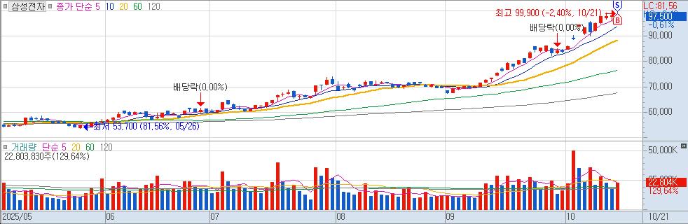 모두가 바라는 10만전자를 앞두고 있어서 매수함. 당일 저점 근처에서 추가매수하여 물림.