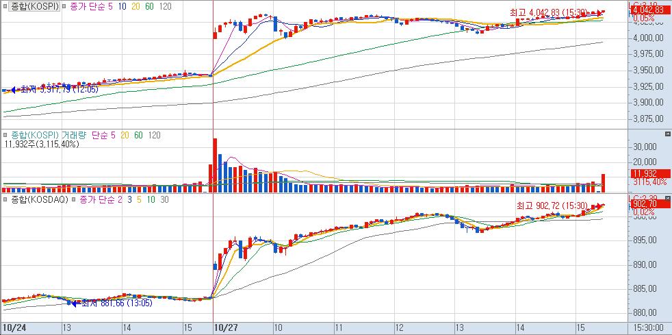 "코스피, 코스닥 최고가 기록. 지속적인 상승으로 마감. 초반에 조선 섹터, 중반이후 개별 섹터 강세. "