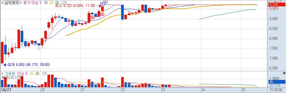 신규주가 차트가 예쁘게 오르고 있었음. 상한가에 가까워 져서 근처에서 눌림 매매를 함.