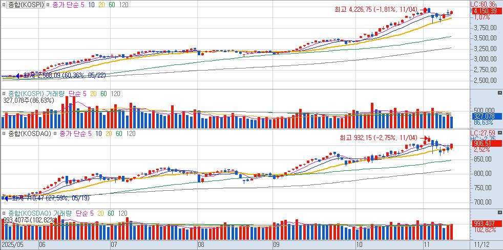 "결국에 지수는 모든 이평선 위로 올라오며 상승하였다. 코스닥은 기관과 외국인이 매수하고, 코스피는 외국인의 매도세가 줄지 않았다. 그래서 대형주 위주의 수급이 전체적으로 흩어진 모양이다. 다양한 종목이 급등하고 급락한다. 전쟁터 같다. 면역항암제, 의료AI 테마가 새롭게 보였다."
