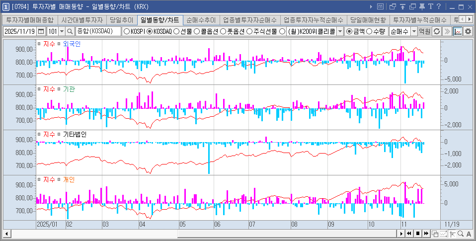"미국말 'AI 거품론'에 따른 뉴욕 증시 기술주 하락의 영향으로 약세를 보였다. 코스피와 코스닥은 하락 마감하였다. 외국인이 1조원 넘게 순매도하였고, 기관과 개인은 순매수하여 이를 방어하려는 움직임을 보였다. 국내에서는 UAE의 '스타케이트 프로젝트'관련 협력 소식이 전해졌으나, 시장 전반의 하락 분위기를 상쇄하기에는 역부족이었다. 뚜렷한 주도 테마는 없고, 한성기업(중국, 일본 수산물 수입 중단), 천일고속(서울고속터미널 재개발)등 개별 이슈로 상한가를 기록했다."