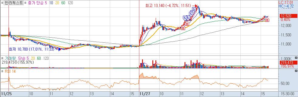 당일 수급이 들어오는 것을 알고 있었는데, 난 이뮨온시아를 택했었다. 이뮨온시아 거래를 마무리 하고, 한라캐스트를 보니 20선 위로 슬며시 올라와 있었다. 바로 매수 했는데 매수가 되지 않아 추격매수해서 샀다. 직전 저점까지 여유가 있었다. 장 마지막에 종가 매매도 했다.