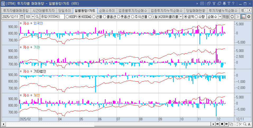 "미 연준의 금리 인하라는 확실한 호재도 '네 마녀의 날(선물·옵션 만기일)' 변동성 앞에서는 힘을 못 쓰는 허무한 하루였다. 장 초반 분위기는 좋았지만, 기관이 무려 7,900억 원어치 매물 폭탄을 쏟아내며 코스피를 결국 4,110선까지 끌어내리고 말았다. 외국인이 순매수로 방어하려 애썼지만, 대형주 위주로 쏟아지는 차익 실현 물량을 받아내기엔 역부족이었다.
