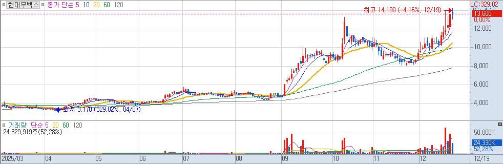 | 현대무벡스 | KRW | +3.35% | +7,216원 |