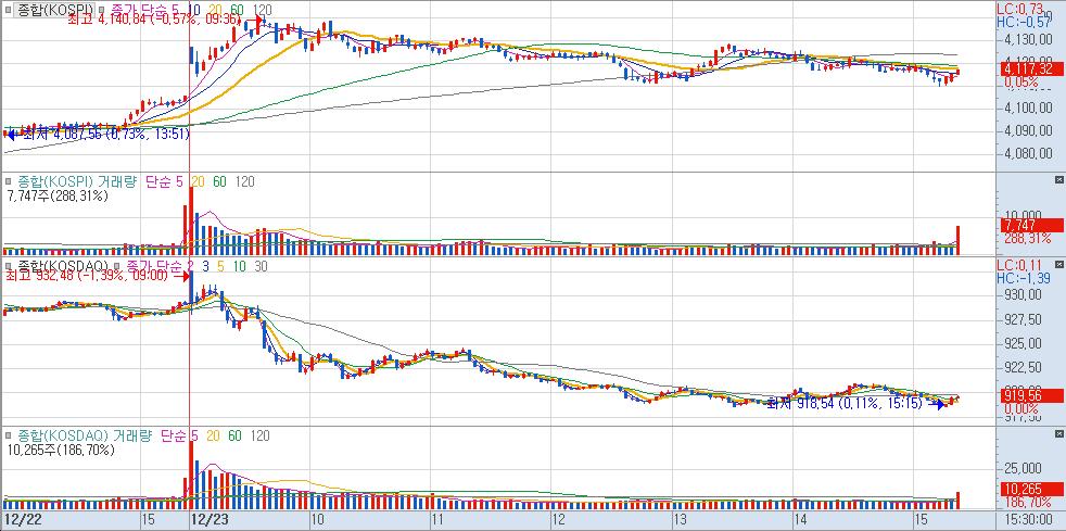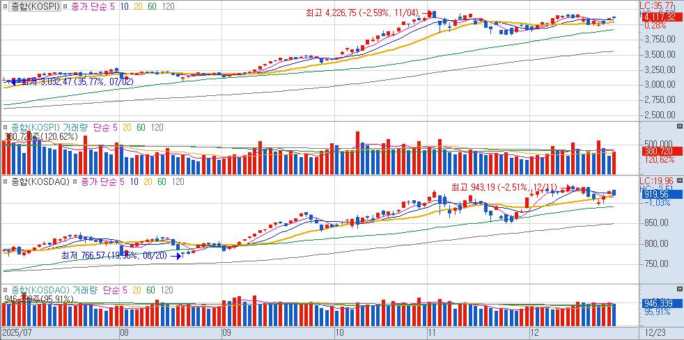 "국내 증시는 미국발 산타 랠리 기대감과 수급 불균형이 교차하며 다소 복합적인 흐름을 보였다. 코스피는 외국인과 기관이 1.3조 원 규모를 동반 순매수한 덕분에 사흘 연속 상승하며 4,117선에 안착했다. 반면 코스닥은 외국인의 매도 공세에 1% 넘게 밀리며 920선을 내주는 등 양 시장의 온도차가 뚜렸했다.
