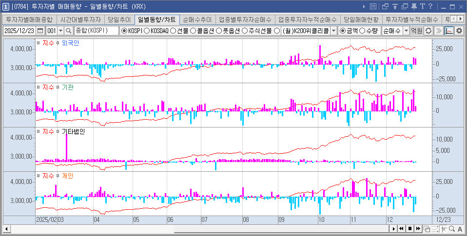 개인이 대규모 차익실현 매물을 쏟아내며 해외로 눈ㅇㄹ 돌리는 현상은 우리 증시의 장기적 전망에 대한 시장의 신중론을 뒷받침한다. 1,480원을 돌파한 원/달러 환율의 변동성과 미 관세 정책에 따른 수출 기업의 재무 건전성 우려 역시 여전한 리스크이다. 연말 산타 랠리의 지속 여부는 결국 미국 기술주 흐름과 국내 기관 수급의 연속성에 달려 있다. 내일도 매크로 변수를 면밀히 주시하며, 실적 기반의 업종 위주로 보수적인 관점을 유지해야겠다."