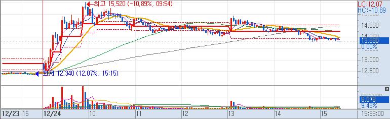 일봉상 신고가 14,240원 위에서 버티고 있어서, 강하게 돌파할 때, 따라들어갔다. 사실 운이 좋았다. 그전에 따라 들어갔으면, 물린 것이다. 그전 돌파하고 눌릴 때, 매수했으면 정말 좋았을 것이다.