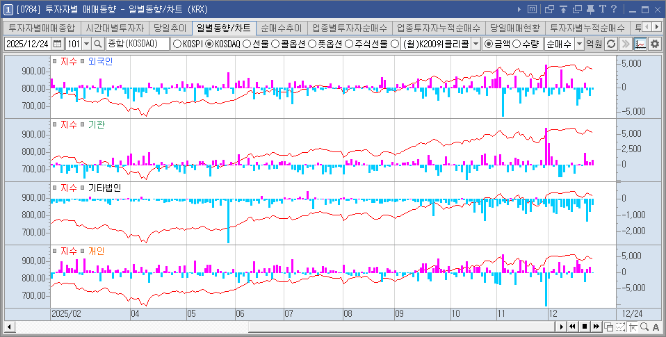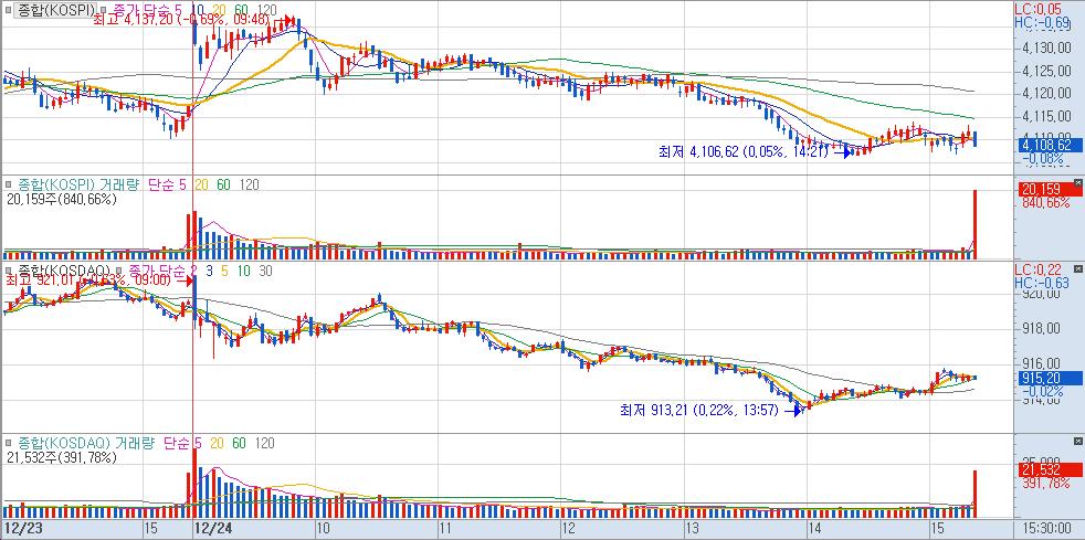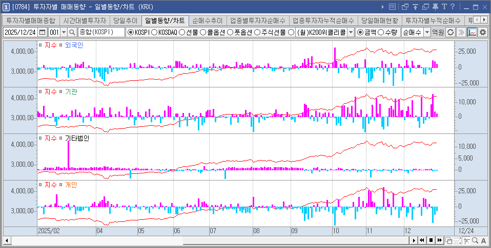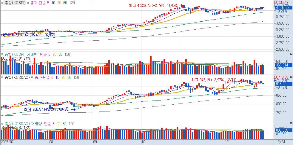 "크리스마스 이브, 국내 증시는 전형적인 '연말 관망세' 속에서도 기관이 매수 우위가 돋보인 정중동의 장세였다.오늘 시장의 핵심은 단순한 지수 등락보다 대주주 양도세 관련 물량을 기관이 성공적으로 소화하며 하방 경직성을 확보했다는 점에 주목해야 한다.