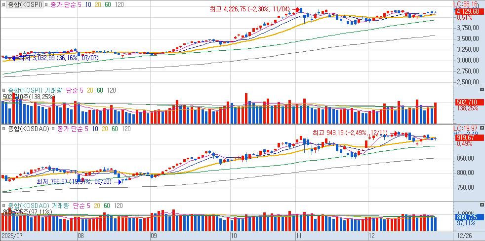 CES 2026 기대감을 품은 반도체와 선별적인 바이오 강세는 내년 초 '1월 효과'에 대한 시장의 확신을 보여주었다. 이제 시선은 월요일 배당락 이후 수급 공백과 고배당주의 단기 변동성 관리로 향하고 있다.