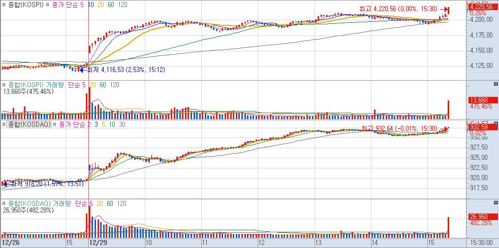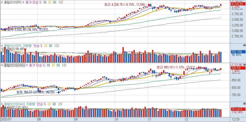 "외국인의 폭발적인 매수세에 힘입어 4,220.56선을 탈환하며 연말 산타 랠리의 정점을 찍는 드라마틱한 하루를 보냈다. 삼성전자가 역대 최고가를 경신하고 SK하이닉스가 급등하는 것을 보며, 역시 우리 시장의 심장은 반도체임을 다시 한번 실감했다. 특히 한화에어로스페이스와 펩트론 등 방산과 바이오 섹터가 주도 테마로 부상하며 지수 상승을 견고하게 뒷받침해준 점이 인상적이었다. 상법 개정을 통한 거버넌스 혁시 기대감과 미 연준의 금리 인하 기조가 맞물리며 고질적인 '코리아 디스카운트'가 해소되는 서막이 열리는 듯한 기분이 들었다. 원/달러 환율이 1,429.8원으로 안정세를 찾으며 외국인 수급의 든든한 버팀목이 되어준 것도 시상의 질을 높인 핵심 요인이었다. 코스닥 역시 HLB와 알테오진 등 헬스케어 대형주들의 활약 속에 932.59선에 안착하며 뜨거운 투자 열기를 증명했다. 비록 LG에너지솔루션 등 이차전지주는 쉬어갔지만, 시장 전체의 온기는 그 어느 때보다 따뜻해 내일 있을 올해 마지막 거래일이 더욱 기대된다. '코스피 5,000'이라는 미답의 고지가 이제는 단순한 구호가 아닌 가시권에 들어온 실체적인 목표로 다가온 역사적인 월요일이었다. 거시경제의 불확실성 속에서도 정책 모멘텀과 기업 실적을 믿고 인내한 시간이 결국 시장의 화답으로 돌아온다는 진리를 깊이 새긴다. 오늘처럼 주도주가 명확하고 수급이 뒷받침되는 장세에서는 흐름에 몸을 맡기는 유연함이 가장 큰 무기임을 다시금 복기한다."