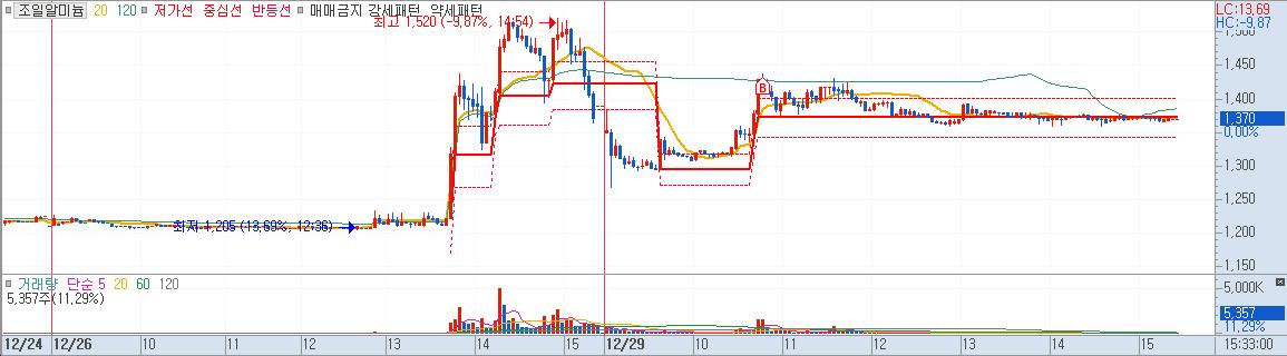 비철금속 테마에 수급이 들어오고 있었다. 딱 거기까지였다. 일봉 고점 돌파하기에 매수하였는데 1시간 30분동안 상승한 후였다. 다행히 탈출하였다.