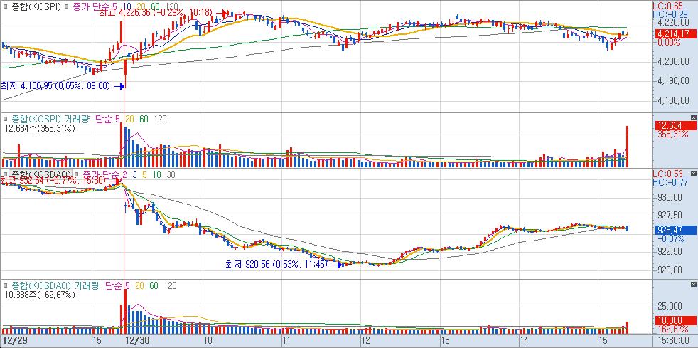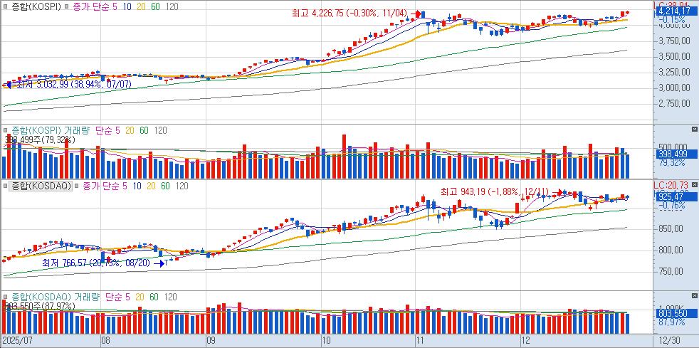 "2025년의 마지막 거래일인 오늘, 국내 증시는 차익 실현 매물 속에서도 역사적인 한 해를 마무리하는 뜨거운 열기를 보여주었다. 코스피는 전 거래일 대비 0.15% 소폭 하락한 4,214.17로 마감했으나, 연간 상승률 75.6%라는 경이로운 기록을 세우며 G20 국가 중 수익률 1위를 차지했다. 특히 '반도체 투톱'인 SK하이닉스와 삼성전자가 자중 나란히 신고가를 경신하며 대장주의 위엄을 과시한 점이 인상적이다. AI 수혜가 지속된 HBM 등 반도체 섹터와 스페이스X 상장 기대감이 반영된 우주항공·방산 테마가 시장의 주도권을 놓지 않았다.