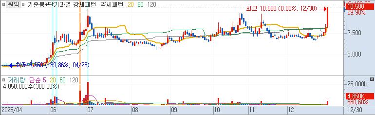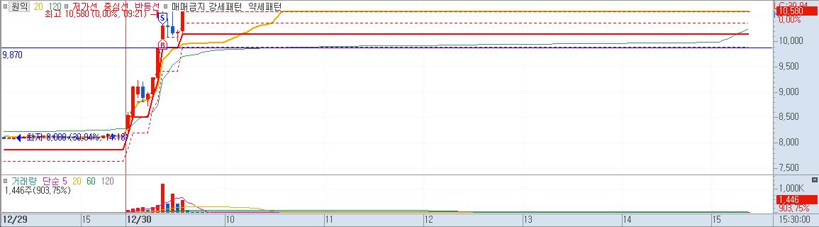 일봉상 고점을 돌파하였다. 바닥권에서 강한 상승이었다. 한번 해볼만 했다. 잔뜩 긴장하고 들어갔다. 원익그룹의 로봇 수혜로 급등한 것으로 보인다.