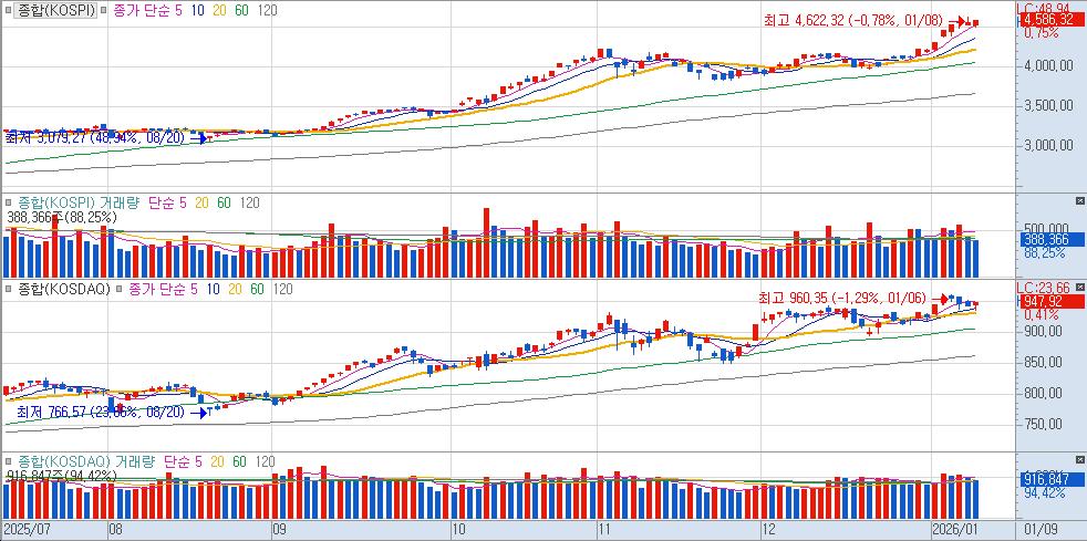 "코스피는 4,586.32로 마감하며 6거래일 연속 상승이라는 기염을 토했다. 장 초반 차익 매물에 4,500선을 위협받기도 했으나, 기관이 1.2조 원을 순매수하는 '구원투수' 역할을 자처하며 지수를 끌어올렸다. 오늘은 명확한 주도주 손바뀜이 일어난 날로 기억될 것이다. 그동안 지수를 견인하던 삼성전자, SK하이닉스가 쉬어가는 사이, 트럼프 대통령의 국방비 5천억 달러 증액 요구 소식에 한화에어로스페이스가 폭등하며 방산 섹터의 불을 지폈다. 코스피 역시 946.92로 마감했으며, 다음 주 JP모건 헬스케어 컨퍼런스를 앞두고 알테오젠이 강세를 보이며 바이오 투심을 살려냈다. 또한 정부가 발표한 'MSCI 선진국 지수 편입을 위한 외한시장 로드맵(24시간 개방 등)'은 향후 외국인 수급 개선에 대한 장기적인 기대감을 심어주기에 충분했다. 시장은 이제 반도체 외발통행이 아닌, 방산·자동차·바이오가 번갈아 달리는 건강한 순환매 장세로 진입했다. 주말 동안은 오늘 급등한 방산주의 지속 가능성과 다음 주 바이오 섹터의 뉴스플로우를 점검하며 유연한 대응 전략을 세워야겠다."