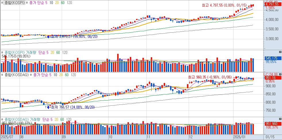 "코스피가 10거래일 연속 상승하며 다시 한번 사상 최고치를 경신하는 역사적인 하루를 보냈다. 외국인과 기관의 강력한 '쌍끌이' 매수세에 힘입어 코스피는 전일 대비 1.58% 오른 4,797.55포인트로 마감하며 4,800선 돌파를 눈앞에 두었다. 시장의 주인공은 단연 삼성전자(+2.57%)와 기아(+6.64%)였으며, 특히 기아는 수출 호조와 원화 약세 수혜 기대감으로 압도적인 상승률을 기록햇다. 당일 '로봇(휴머노이드/산업용)' 섹터가 주도 테마였고, 일본 야스카와와의 협업 소식이 전해진 포스코DX가 상한가에 안착했고, 레인보우로보틱스(+13.07%) 등 관련주들이 동반 폭등했다. 한국은행이 금리를 2.5%로 동결하며 매파적 기조를 보였음에도, 미 재무장관의 '원화 저평가' 발언이 환율 하락을 이끌며 증시에는 오히려 호재로 작용했다. 다만, 장중 발표된 트럼프 대통령의 '반도체 관세 협상 포고문'은 향후 우리 반도체 기업들에 적지 않은 심리적 압박과 정책적 불확실성을 던져주었습니다. 오늘 장을 복기해보면 로봇과 같은 '피지컬 AI'가 실질적인 산업 현장에 침투하며 시장의 주도권을 완전히 쥐었음을 체감할 수 있었다. 뜨거운 상승 열기 속에서도 원·달러 환율(1,469.7원)의 변동성과 미국의 관세 압박이라는 대외 변수를 세미할게 살피며 포트폴리오의 균형을 잡아야 할때이다."
